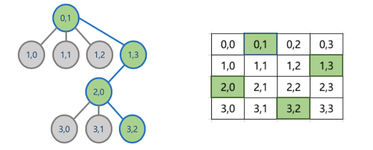 이를테면, 4x4의 체스판에 결과로 [1, 0, 3, 2]가 리턴된다면, (0,1) (1,0) (2,3) (3,2)에 Queen이 존재한다는 것.