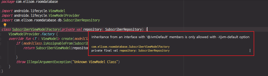 늘 하던 방식대로 ViewModelFactory를 구현했는데 빨간 줄이 뜬다.