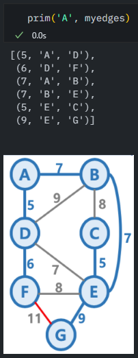 prim('A', myedges)하여 잘 구현되었는지 확인해본다.